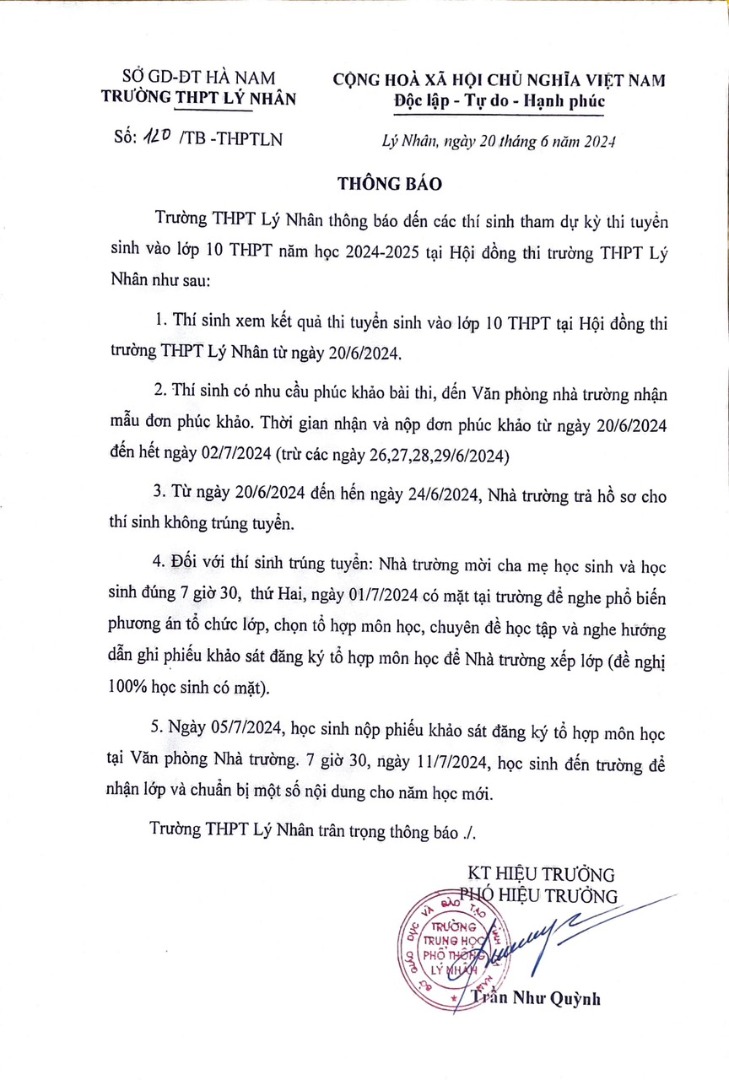 Trường THPT Lý Nhân xin trân trọng thông báo kế hoạch đối với hs đỗ vào lớp 10.